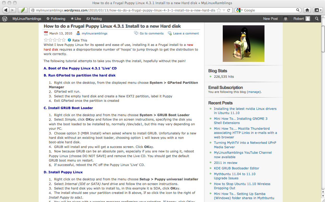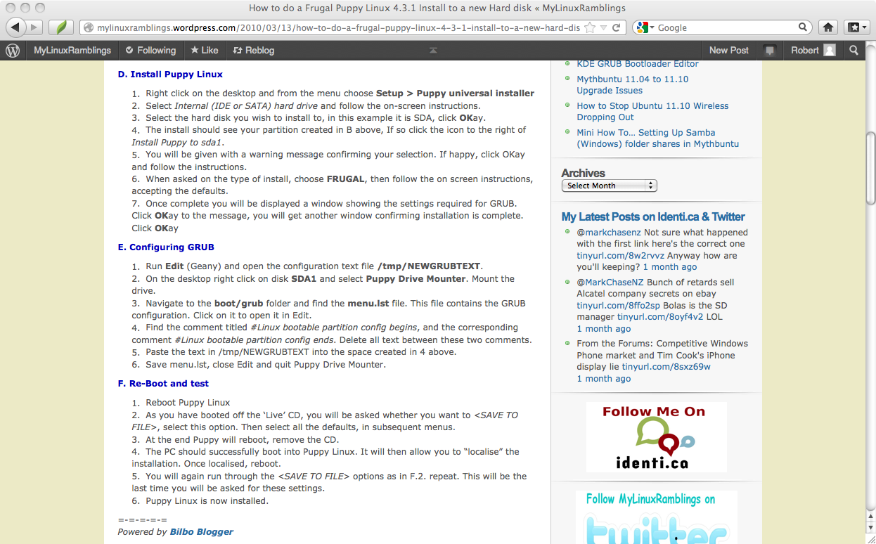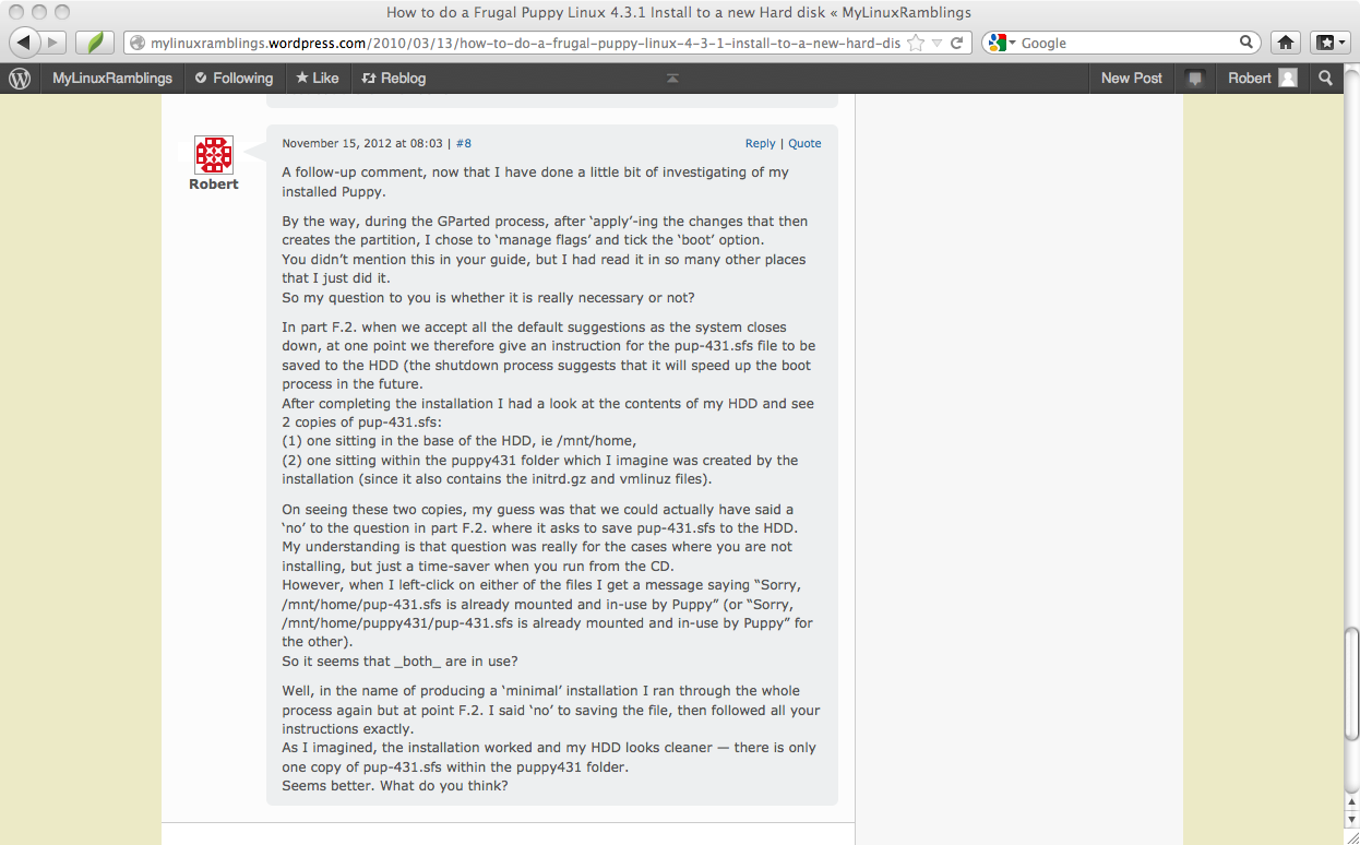 But before you go there, note my comments on that page too: you need to ‘manage flags’ in GParted and make the partition boot-able, and you should answer ‘no’ whenever it asks you to save the file during the shutdown process (you only choose to save it when you do the first shutdown after booting from the HDD-installed Puppy).