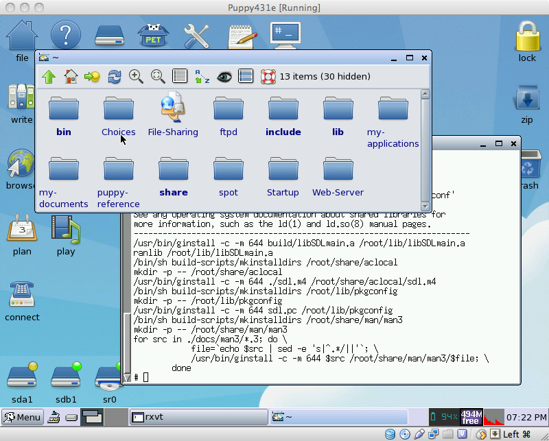 8. As you can see the CD drive is recognized (it will be mounted if you left click it). Here is a snapshot of my desktop showing a couple of locations in the file viewer — the ‘home’ folder is /root and the lowest-level-possible in the filesystem which is /.